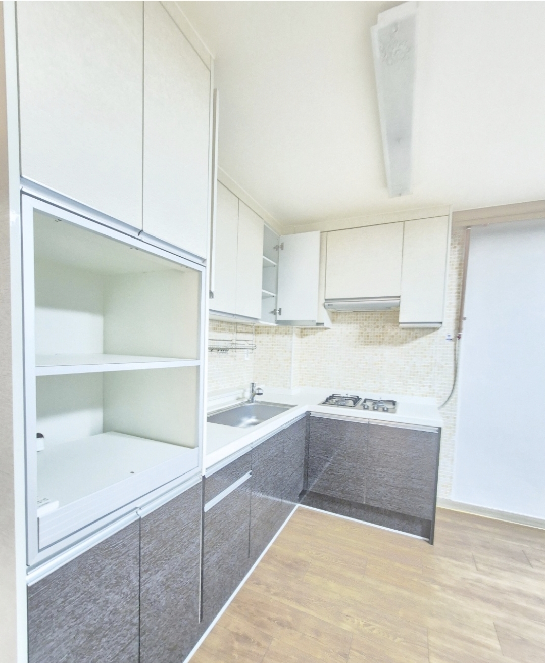 ◑ 주방 싱크대는 수납공간이 많고 ㄱ자구조입니다 가스렌지3구입니다